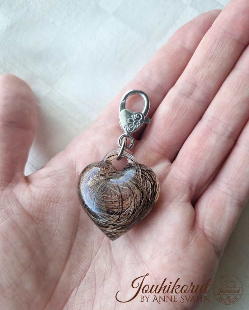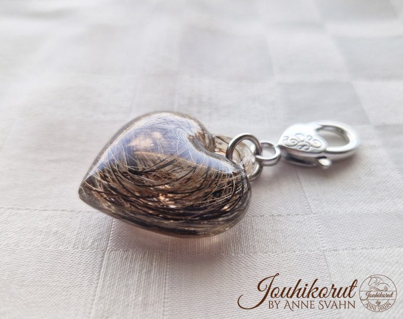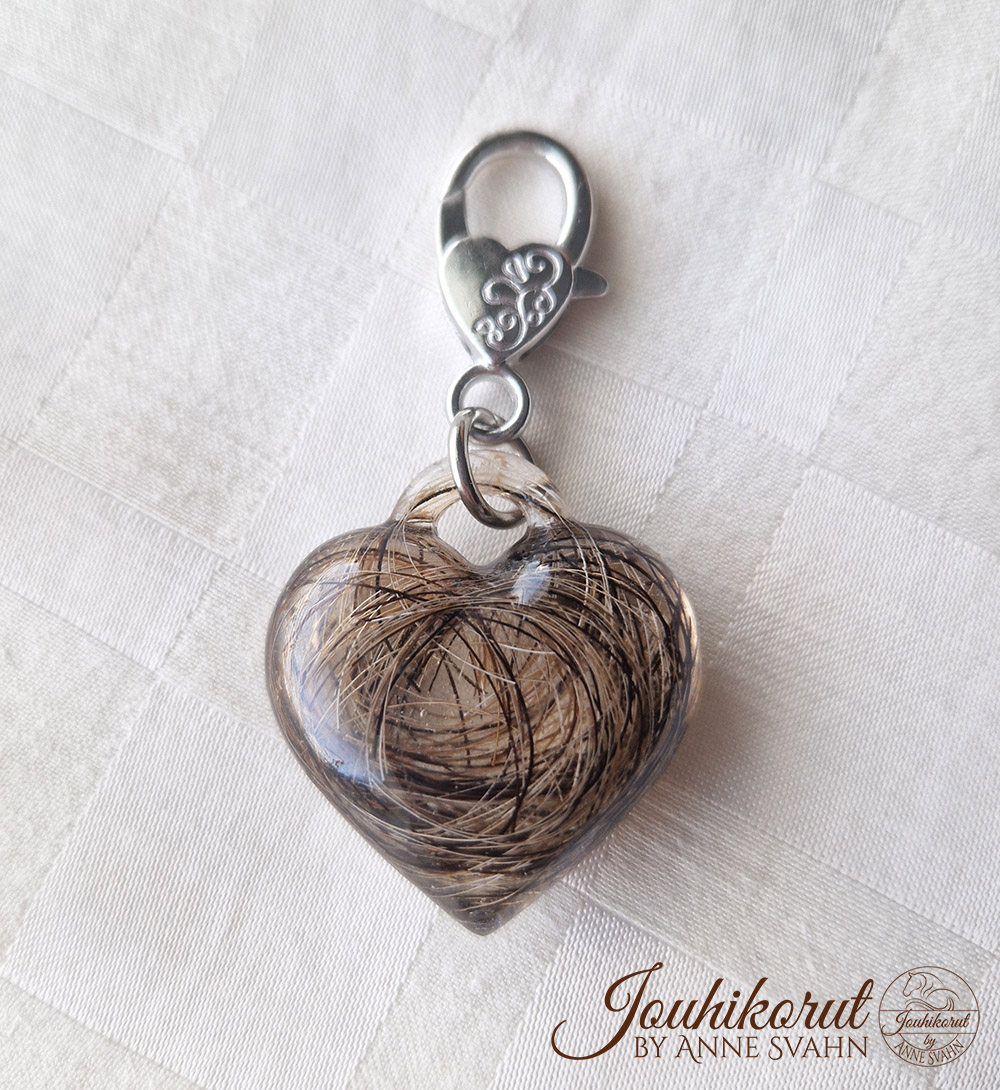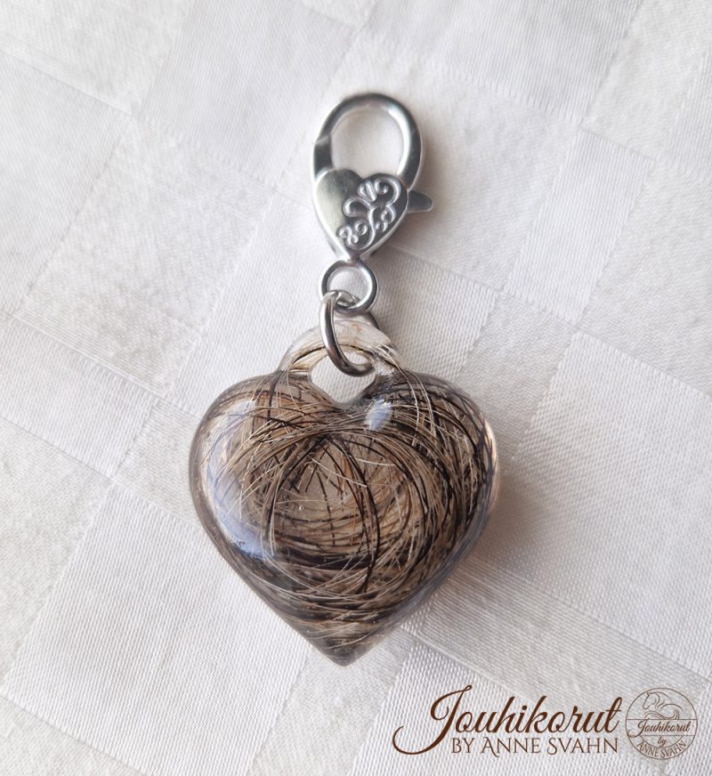 Ihana sydämen muotoinen avaimenperä, jonka sisällä hevosen jouhia tai lemmikin karvoja. Laita vaikka laukkuun koristeeksi! Näin voit kantaa rakasta ystävääsi aina mukana.