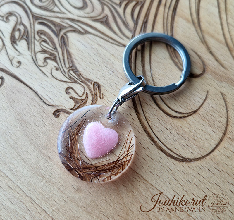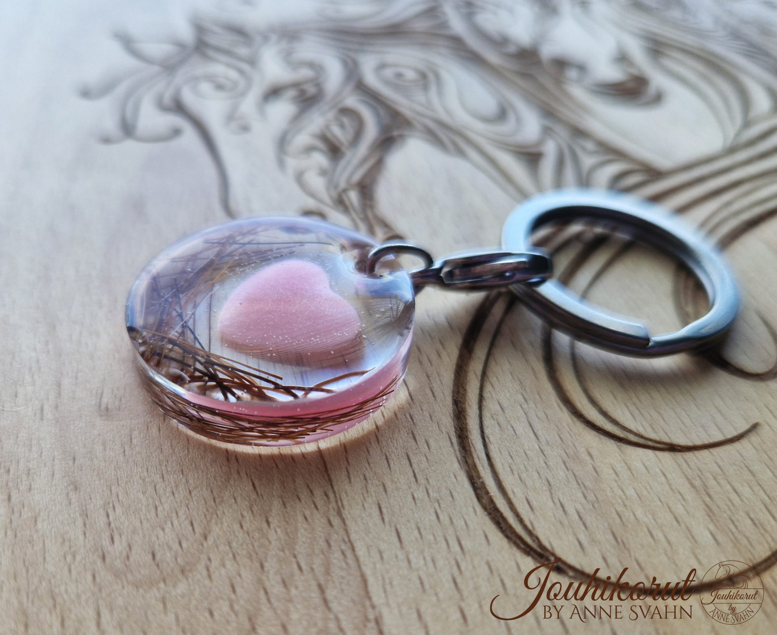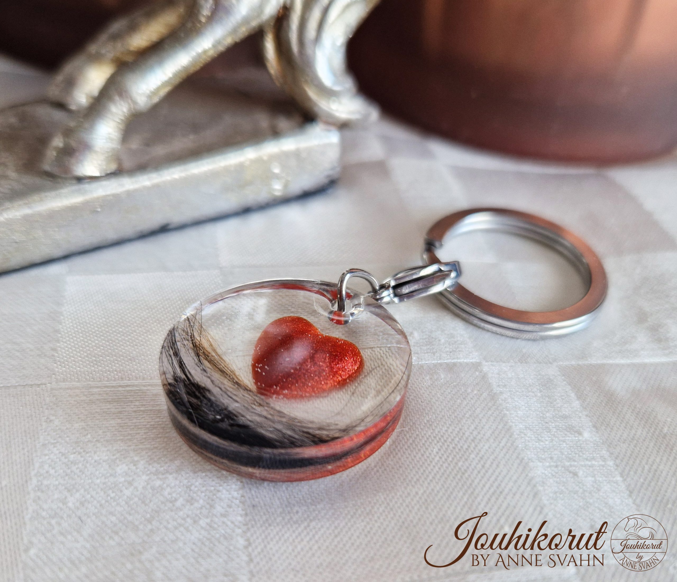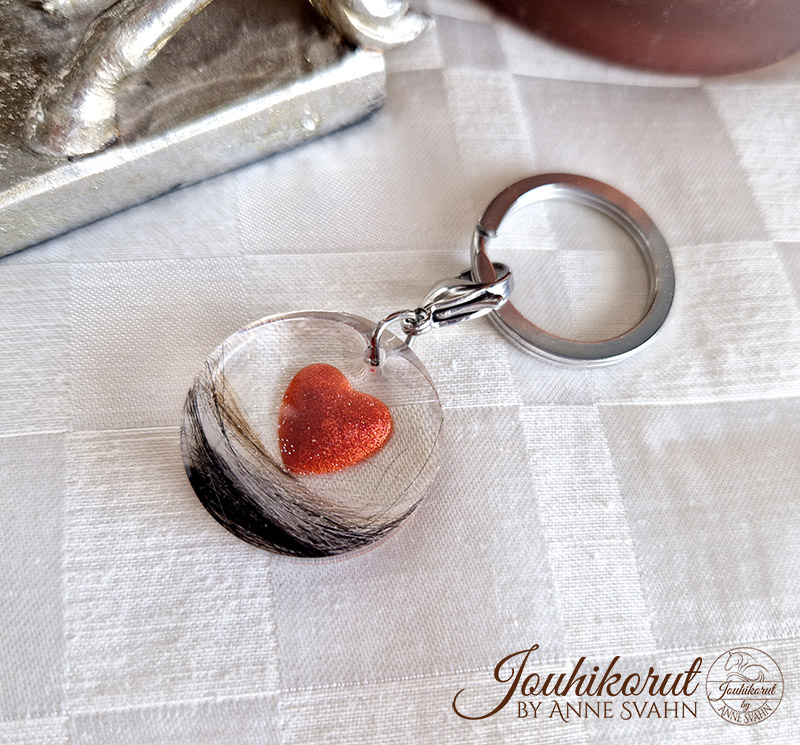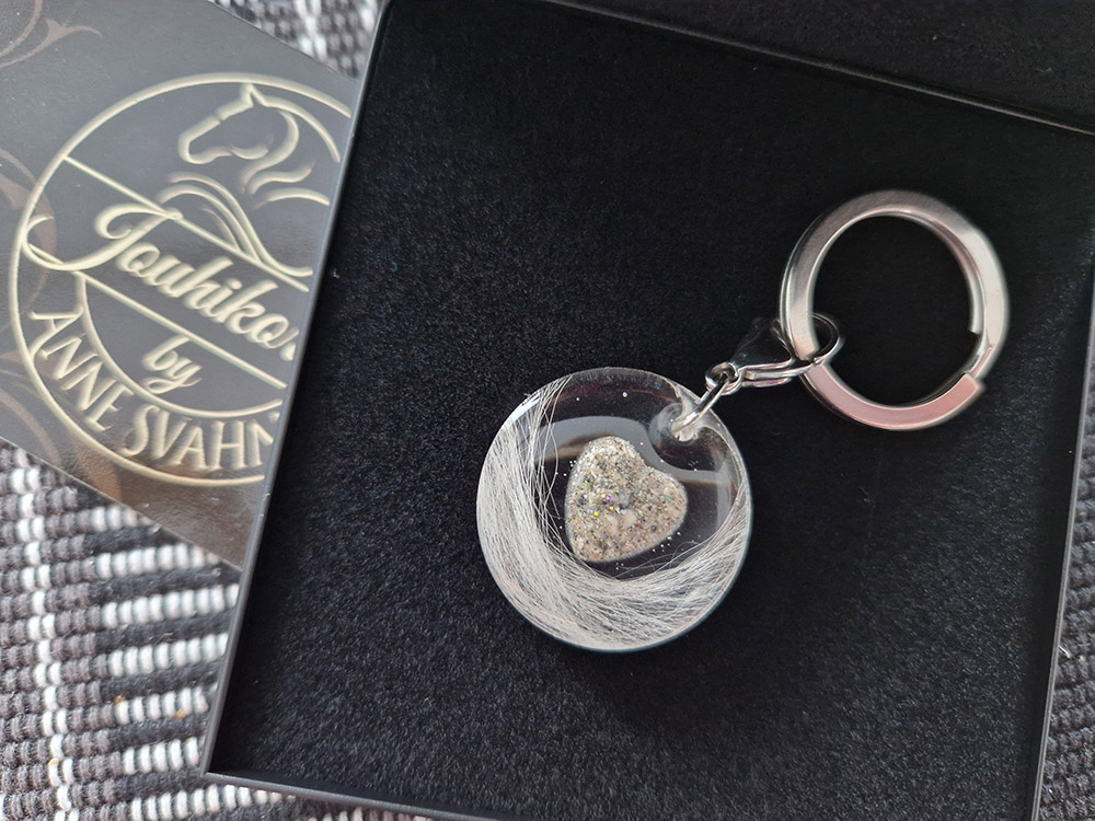 Ihana avaimenperä tai laukkukoriste, jossa sisällä haluamasi värinen sydän ja hevosen jouhia tai lemmikin karvoja! Kolmiulotteinen sydän hohtelee helmiäisväreissä upeasti ja sitä reunustavat oman hevosesi jouhet tai rakkaan lemmikin karvat. Sydämen voi tehdä myös tuhkasta. Valitse haluamasi värinen sydän.