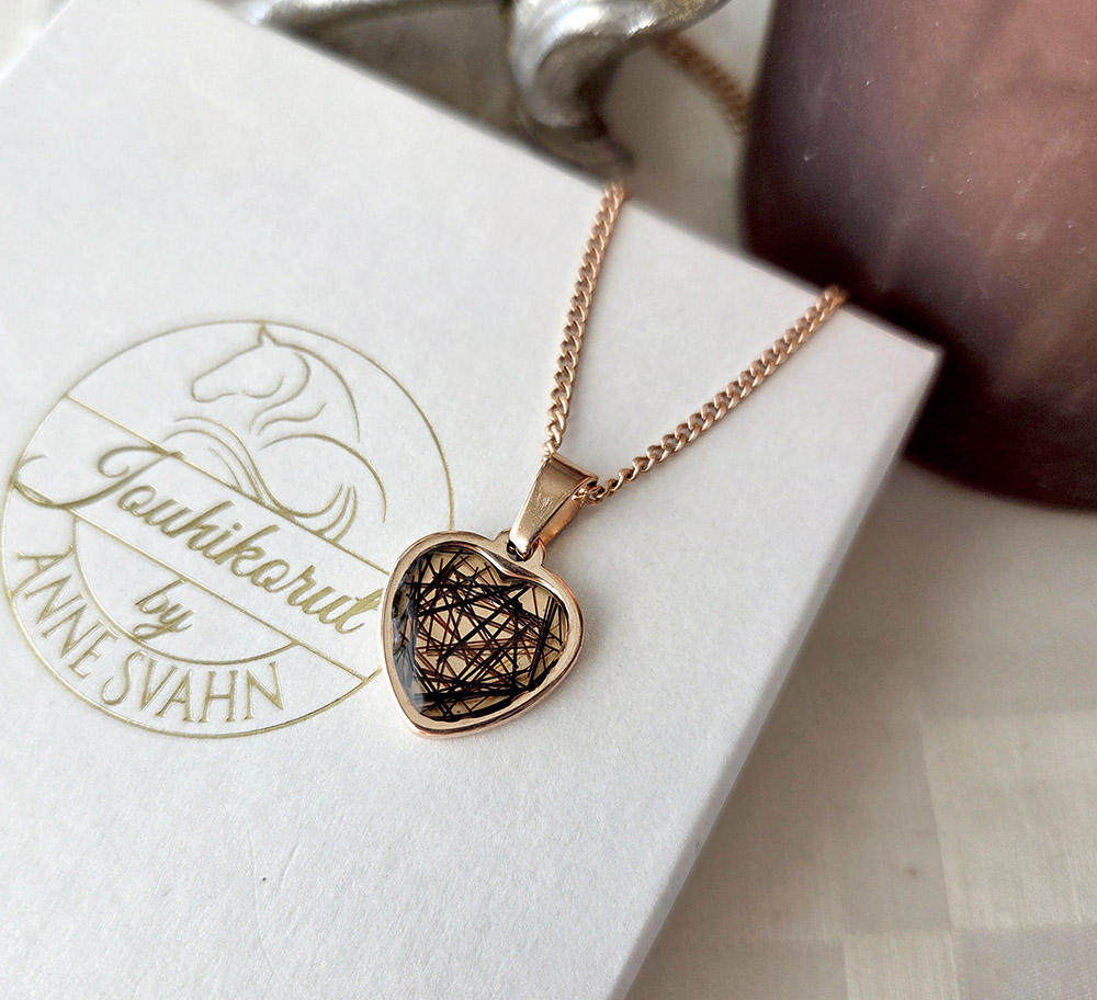 Huom! Koruihin upotettujen jouhien/karvojen väri muuttuu tummemmaksi valmistusvaiheessa, jolloin lopputulos voi olla hieman erilainen verrattuna irrallisiin, ”kuiviin” jouhiin/karvoihin.
