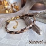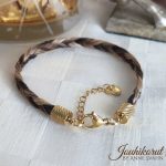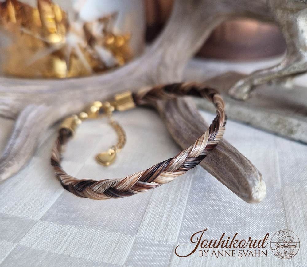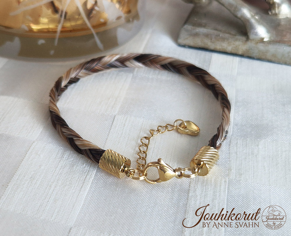 VALMIS KORU. Upea letitetty rannekoru ruskeista jouhista. Letissä erottuvat kauniisti ruskean eri sävyt, jotka sopivat tyylikkääseen kullattuun lukko-osaan. Pituus 18cm + pidennysketju 3cm.