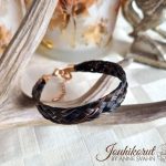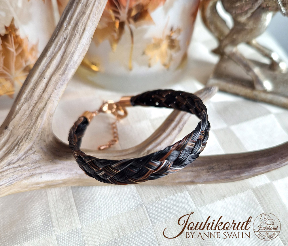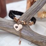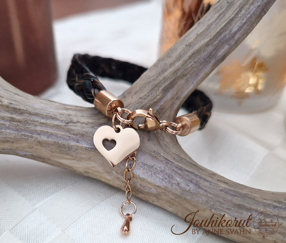 VALMIS KORU. Ruskeista jouhista punottu litteä rannekoru, koristeena sydänriipus. Metalliosat ruusukullattua ruostumatonta terästä.