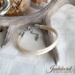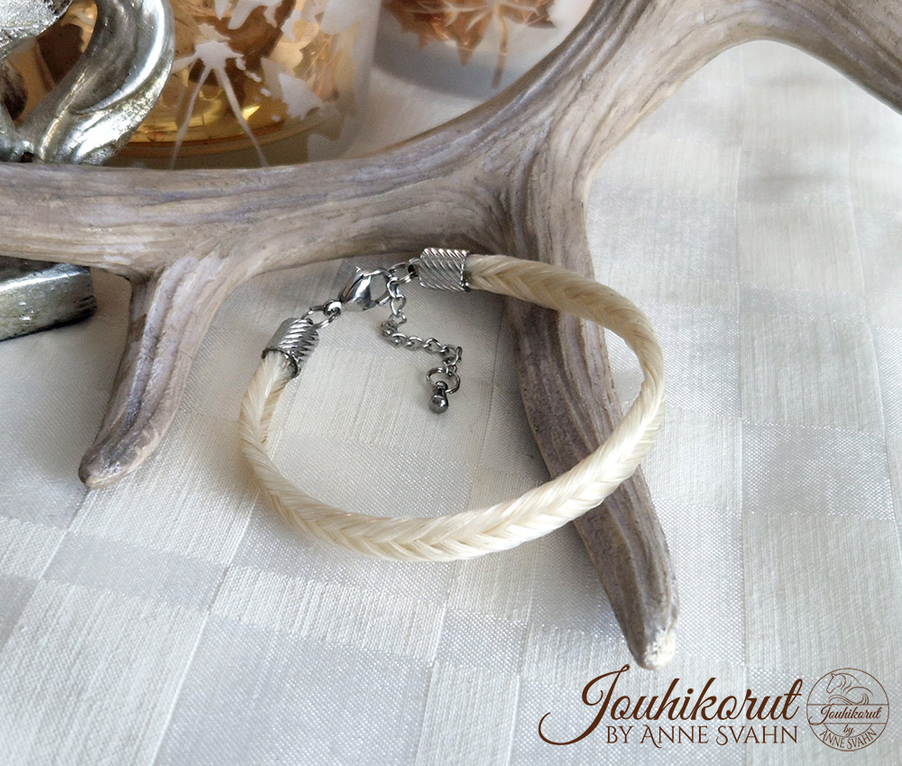 VALMIS KORU. Valkoisista jouhista punottu tyylikäs rannekoru. Metalliosat ruostumatonta terästä. Pituus 17cm + pidennysketju 3cm.