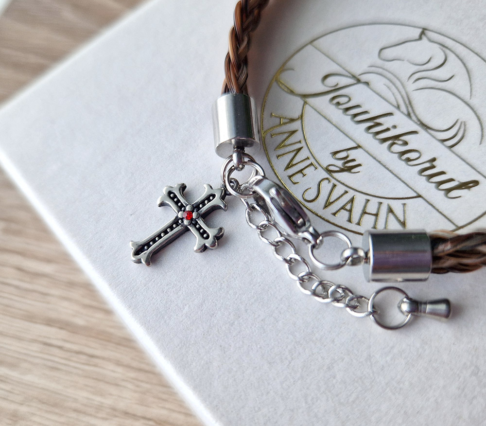 Kaunis pieni risti ruostumatonta terästä, koristeena punainen pieni ”timantti”. Koko 11 x 17 mm. Sopii koristeeksi esimerkiksi rannekoruun.