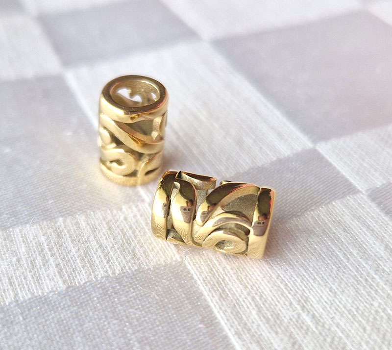 Kaunis filigreehelmi kullattua ruostumatonta terästä. Sopii 5-6mm punokseen.